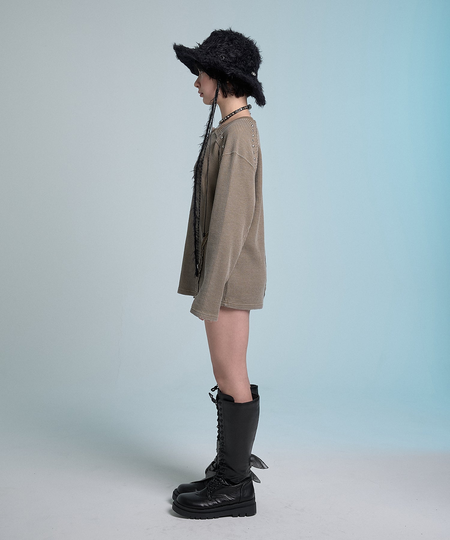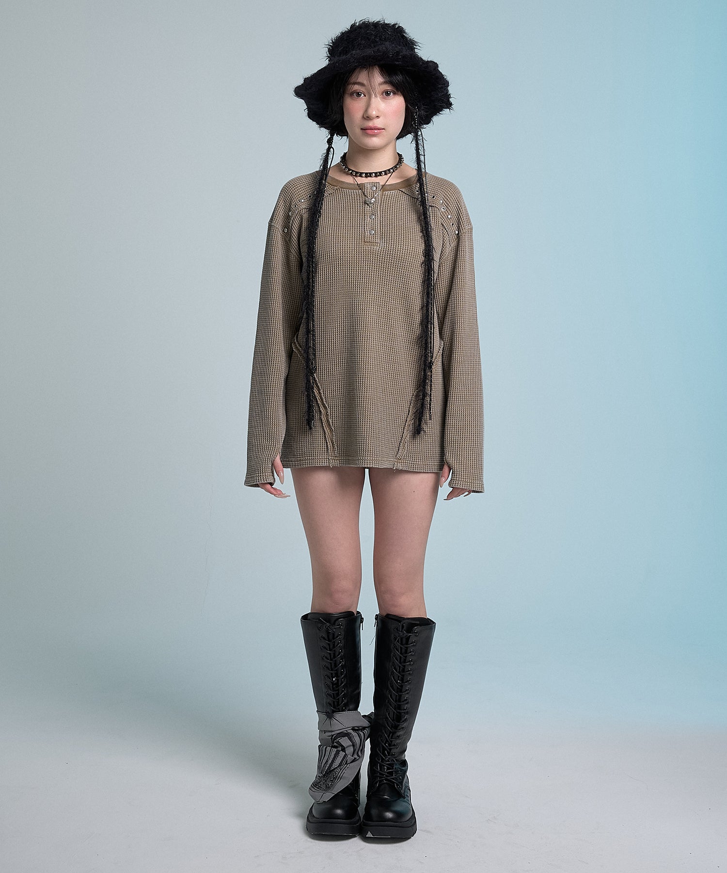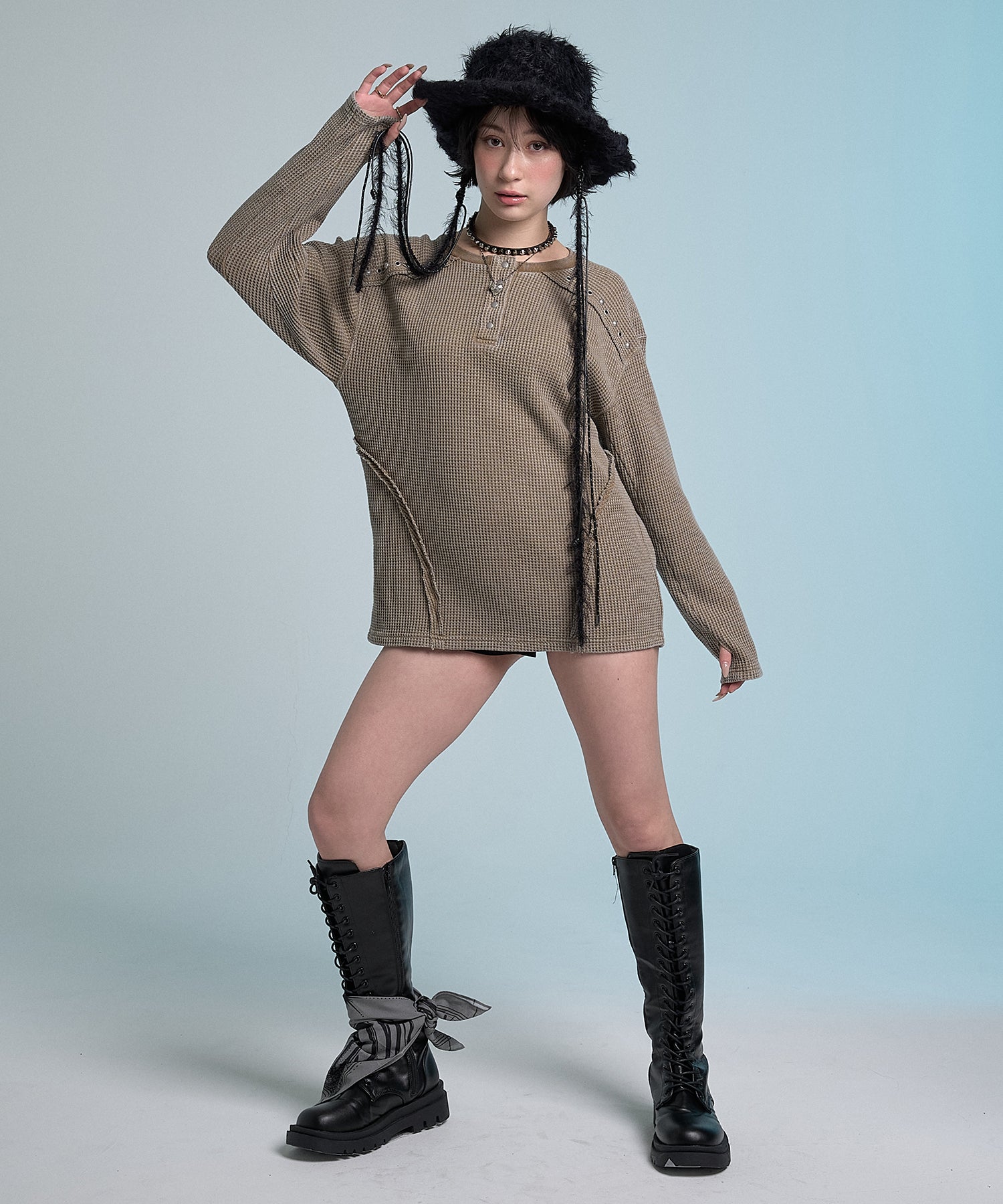 ショルダーラインの、スタッズとアイレットの交互の配置が目を惹きます。