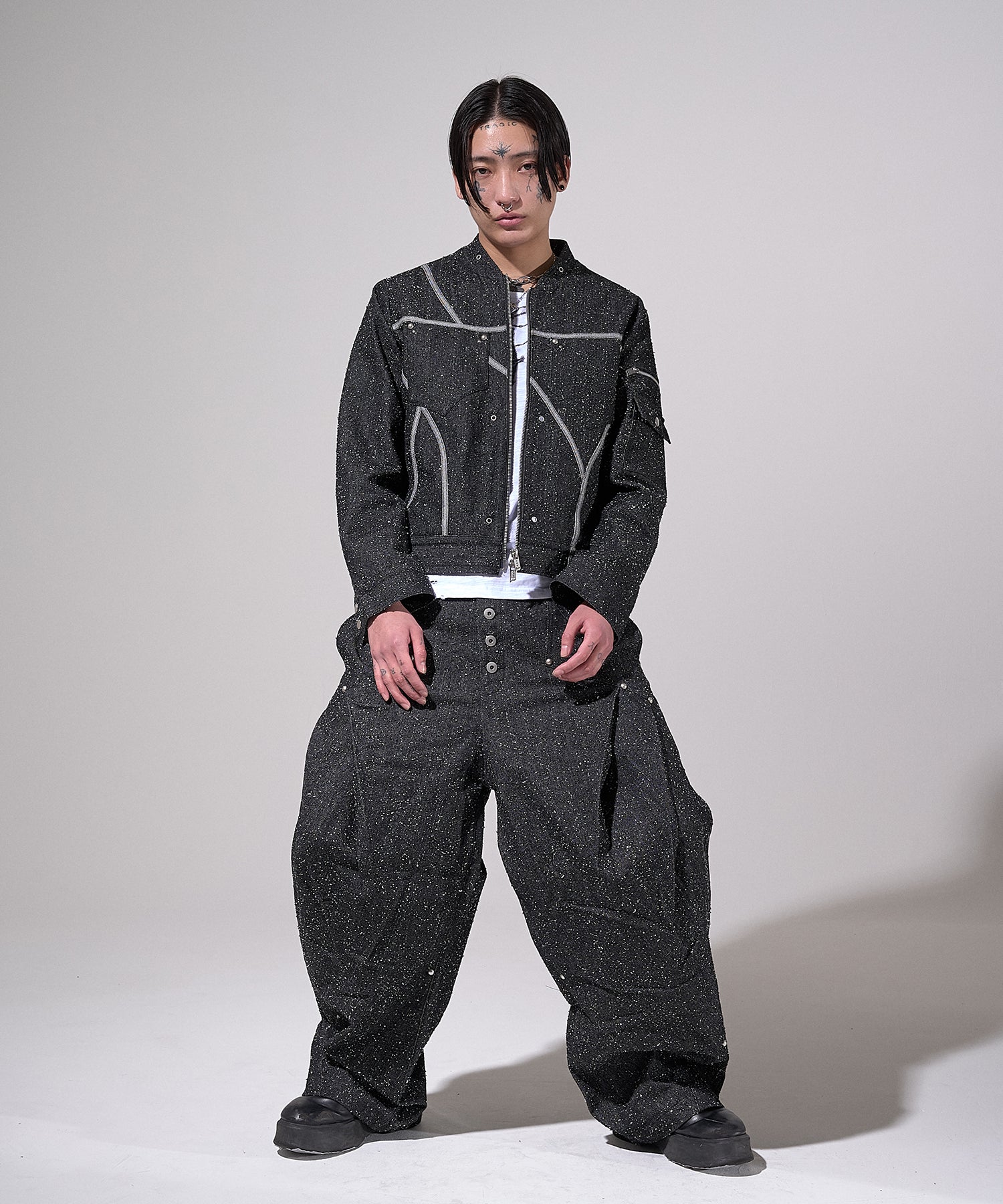 立体的に描かれたカーブステッチが身体のラインをなぞり、クラシックなデニムジャケットの概念を静かに解体する。
