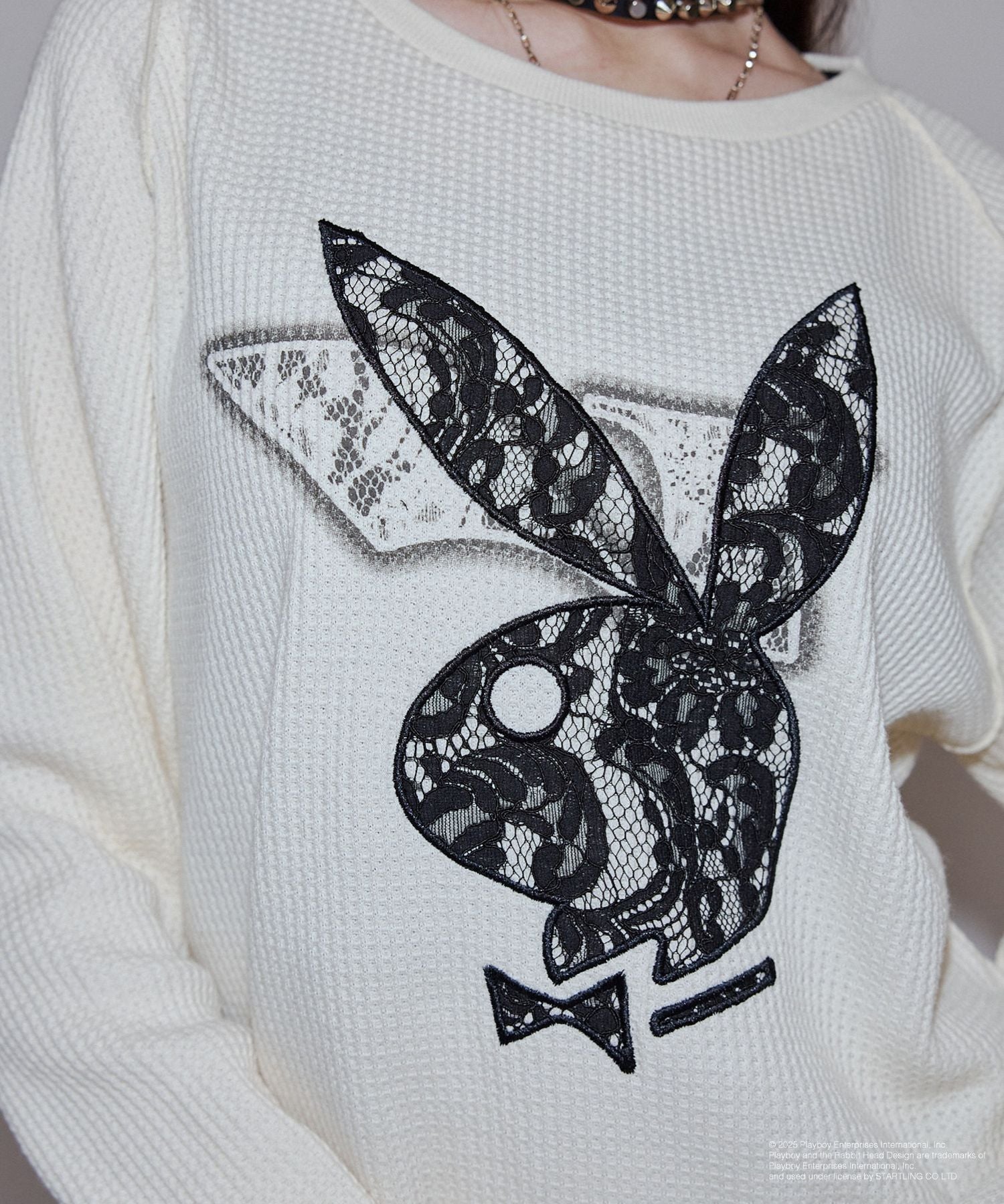ロゴ部分はコードレースを縫い付け、スプレープリントによる奥行きのある仕上がりに。首元はゆったりめで、デコルテを美しく見せるデザイン。ラグランスリーブとサムホール付きの袖が、動きやすさとスタイルの両立を叶える万能アイテム。